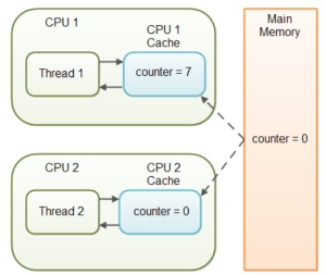 Thread-1은 counter값을 증가시킨다. 하지만 CPU Cache에만 반영, 실제로 Main Memory에는 반영X → Thread-2는 count값으로 0을 가져오는 문제 발생