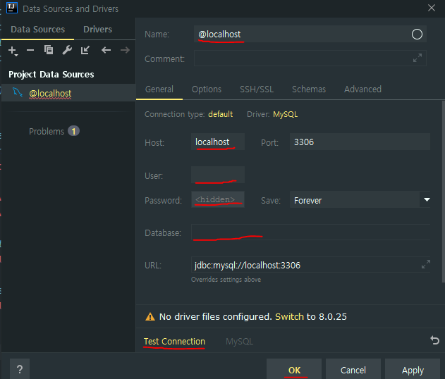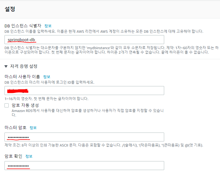 User와 Password 에는 생성할 때 설정한 마스터 이름과 암호를 입력해준다.