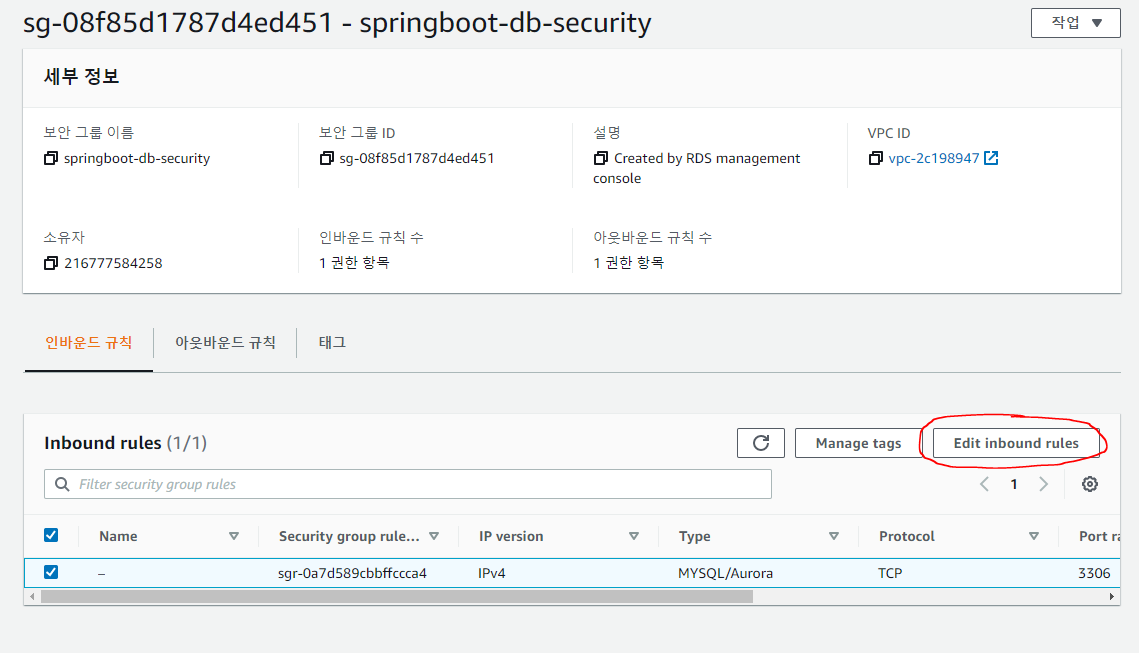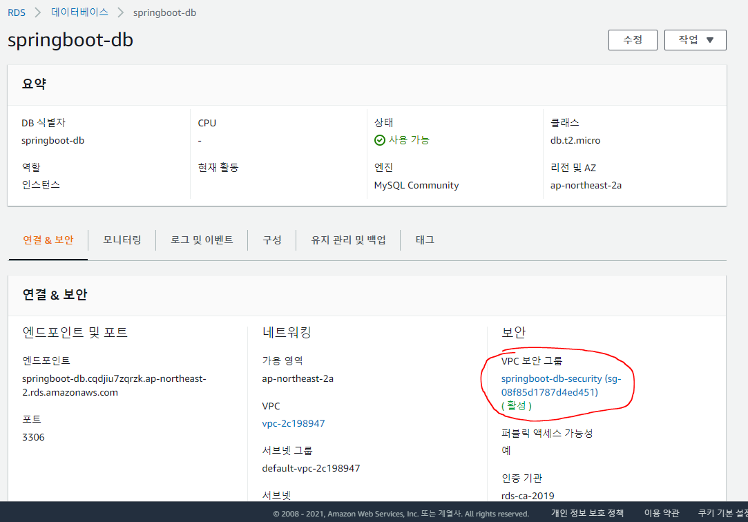만들어진 데이터베이스를 클릭하고 들어가서 보안그룹 설정을 해보자