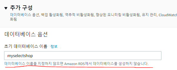 추가 구성에서 초기데이터베이스 이름 꼭 설정하기