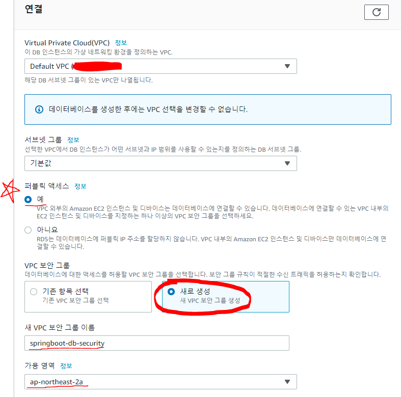 "예"로 변경해줘야 한다. 그래야 접속을 할 수 있다.보안그룹도 새로 설정할 것이기 때문에 만들어준다.