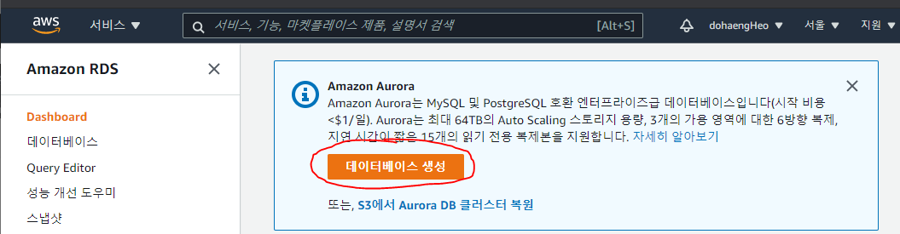 AWS RDS 서비스에 접속해서 데이터베이스를 먼저 생성해보자
