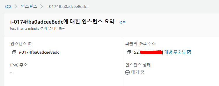 그리고 뒤에 퍼블릭 ip 주소는 생성한 EC2 인스턴스에 들어가서 복사하면 된다.