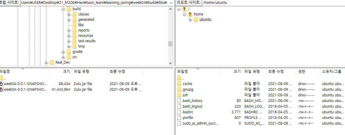 다음으로 FileZilla 라는 프로그램을 이용해서 EC2 인스턴스로 배포파일을 전송해보자.