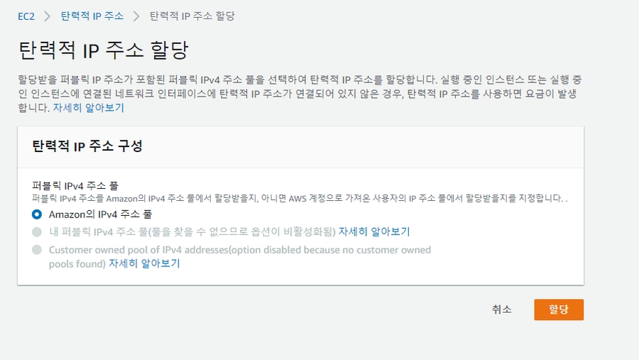 인스턴스와 주소연결탄력적 IP는 생성하고 EC2 서버에 연결하지 않으면 비용이 발생합니다. 즉, 생성한 탄력적 IP는 무조건 EC2에 바로 연결해야 하며 만약 더는 사용할 인스턴스가 없을 때도 탄력적 IP를 삭제해야 합니다.