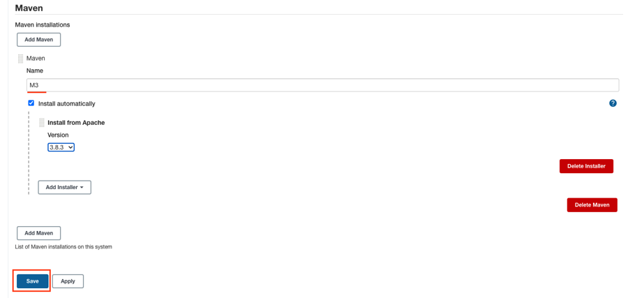 파이프라인을 실행하기 전에 전역 도구 환결 설정에서 파이프라인에서 사용될 도구를 설정해야함 (ex) 깃, 메이블, 자바, 등등) 위치 : Jenkins 관리 -> Global Tool Configuration 로 이동 후 다음과 같이 적용