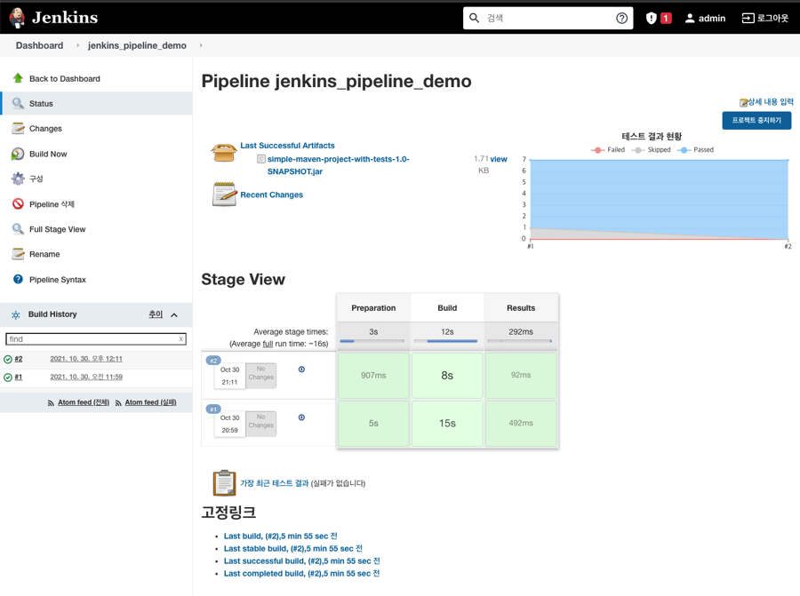 젠킨스 대시보드로 가면 다음과 같이 처음에 만든 파이프라인이 리스트에 나온다