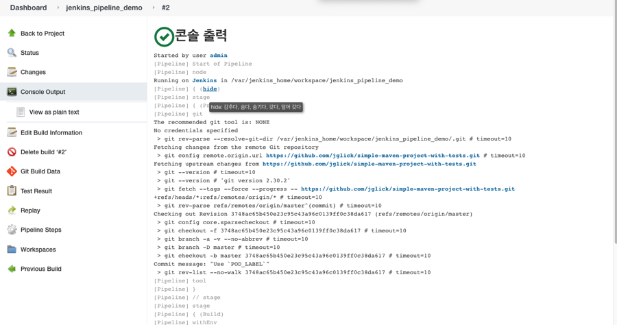 빌드한 콘솔을 보기 위해서 빌드 히스토리에 마우스를 올리면 다음과 같이 드롭다운 메뉴가 나타남