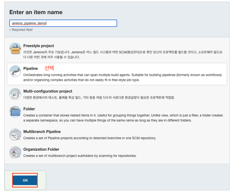 파이프라인 탭을 클릭 후 스크립투 부분에 try sample pipeline이라는 셀랙트 박스에서 Scripted Pipleline 선택 후 저장!!