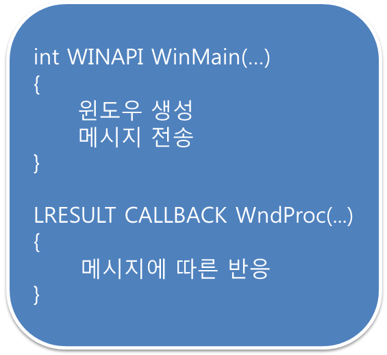 이벤트 -> 이벤트 처리 개발자는 메세지를 처리하는 함수를 작성하고, 윈도우를 생성하여 출력만 진행하면 된다.