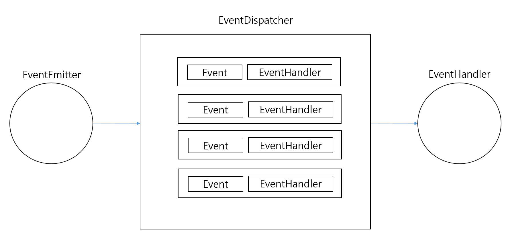 eventEmitter가 이벤트를 발생시키면, eventEmitter에서 실행되는 매소드들이 EventHandler가 되며, 이 둘을 관리하는 eventDispatcher가 존재, http://wiki.sys4u.co.kr/display/SOWIKI/1.Event-driven+programming