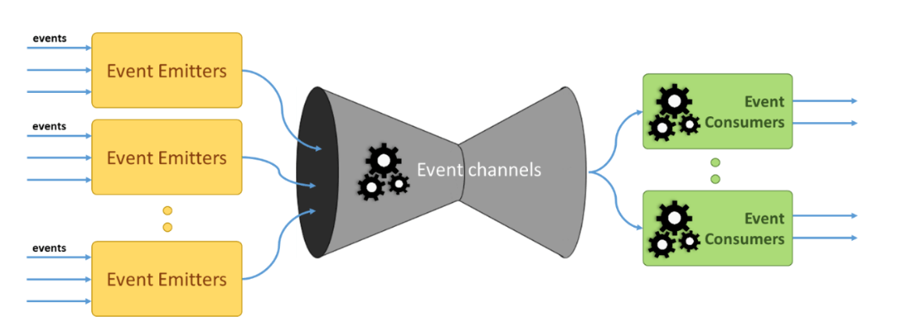 이벤트 스트림을 생성하는 이벤트 생산자와 이벤트를 수신 대기하는 이벤트 소비자로 구성되며, 중간에 핸들링하는 채널이 존재