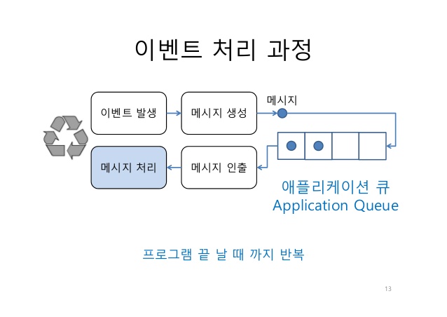 프로그램은 이벤트를 처리하기 위한 이벤트 핸들러를 가지며, 이벤트 루프라는 곳에서 이를 처리한다.