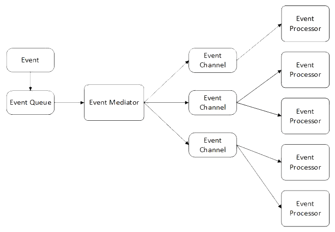 중재자 토폴리지는 단일 큐와 이벤트 중개자를 사용하여 이벤트를 처리, 일반적으로 이벤트 처리에 여러 단계가 필요할 경우 사용