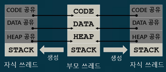스레드는 프로세스 내에서 각각 Stack만 따로 할당받고 Code, Data, Heap 영역은 공유한다.
