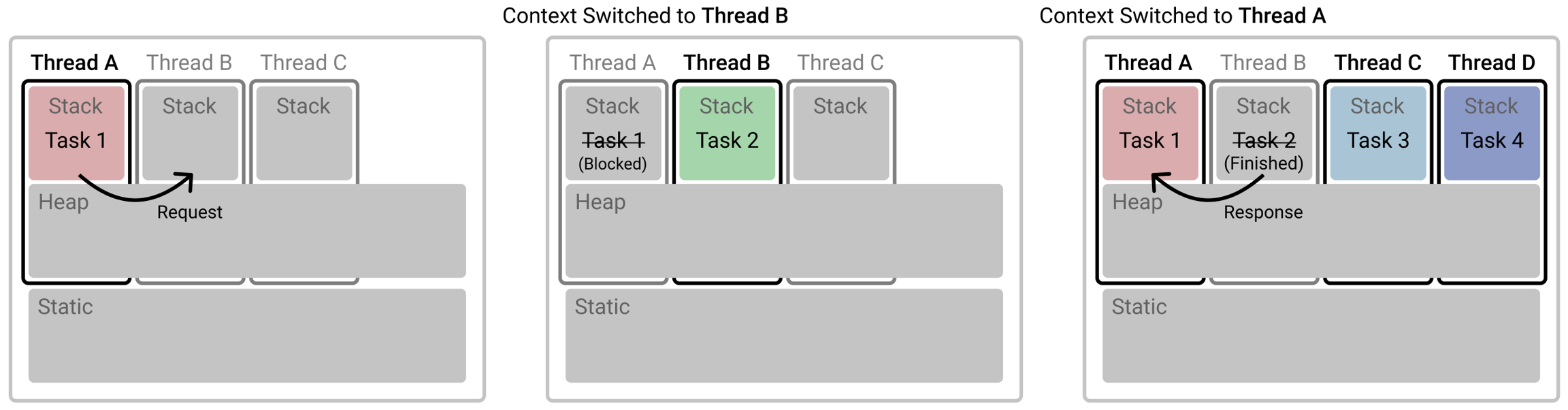 Thread A 에서 Task 1 을 수행하다가 Task 2 의 결과가 필요할 때, 비동기적으로 Thread B 를 호출을 하게 된다. 이 때 Thread A 는 블로킹되고, Thread B 로 Context Switching 이 일어나 Task 2 를 수행한다. Task 2 가 완료되면, 다시 Thread A 로 Context Switching 이 일어나 결과값을 Task 1 에 반환한다.