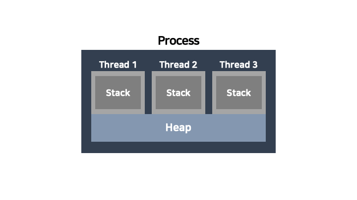 Thread 는 Process 하위에 종속되는 보다 작은 단위이고, 각 쓰레드는 독립된 메모리 영역인 스택(Stack) 을 갖는다. Thread 를 하나 생성하면, 하나의 스택 메모리가 생기는 것이다. 각 쓰레드는 다른 쓰레드에게 스택 메모리를 공유할 수 없다. 하지만 프로세스의 힙은 속한 모든 Thread 가 공유할 수 있다.