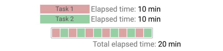 위 예제를 살펴보면, Task 1 과 Task 2 를 잘개 쪼개어 번갈아가며 수행하여 사용자 입장에선 두 작업이 동시에 일어나는 것처럼 느껴지게 된다. 따라서 10분 + 10분, 총 20분이 소요된다. (Context Switching 고려 X)