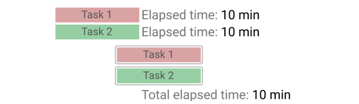 위 예시를 보자. Task 1 과 Task 2 가 병렬적으로 동시에 수행된다. 이는 '멀티코어' 시스템에서 가능한 이야기이다. 코어 각각이 Task 1, Task 2 를 맡아 작업을 수행하면, 완전히 동시에 수행되는 것이다. 따라서, 각각 태스크가 10분씩이라면, 최종적으로 10분이 소요되는 것이다. 이 경우 Context Switching 이 일어나지 않는다.